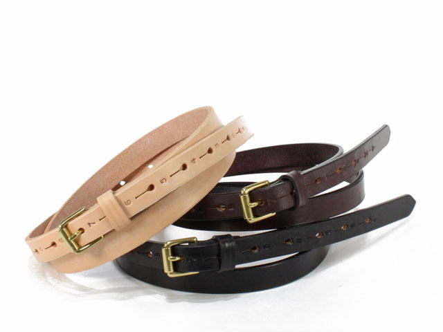 約20mm幅の細身なタイプでJABEZ CLIFF【ジャベツクリフ】のアイコン的デザイン・ベルトホールのナンバリングが施されたホールが20個あります。 ベルト幅の約20mmは、馬具メーカーのJABEZ CLIFF【ジャベツクリフ】らしく馬の手綱(たづな)の規格のようです。 JABEZ CLIFF【ジャベツクリフ】のベルトは、馬具である鞍(くら)と鐙(あぶみ)をつなぐ厚く丈夫な革がモデルです。 ベルトホールのナンバリングは、鞍(くら)の高さを左右で合わせるための名残から由来し、馬具メーカーならではの気の利いたアクセントとなっています。 使用されるブライドルレザーは、ロウでなめされ光沢があり高級感のあるモノで、耐久性も抜群かつ非常に頑丈なものです。 飽きのこないシンプルなデザインに堅牢かつ肉厚なレザーベルトはまさに「一生物」といえるアイテムで、タフなレザーは馴染ませるまで時間がかかりますが経年効果が楽しめ自分だけの一本となります。 |